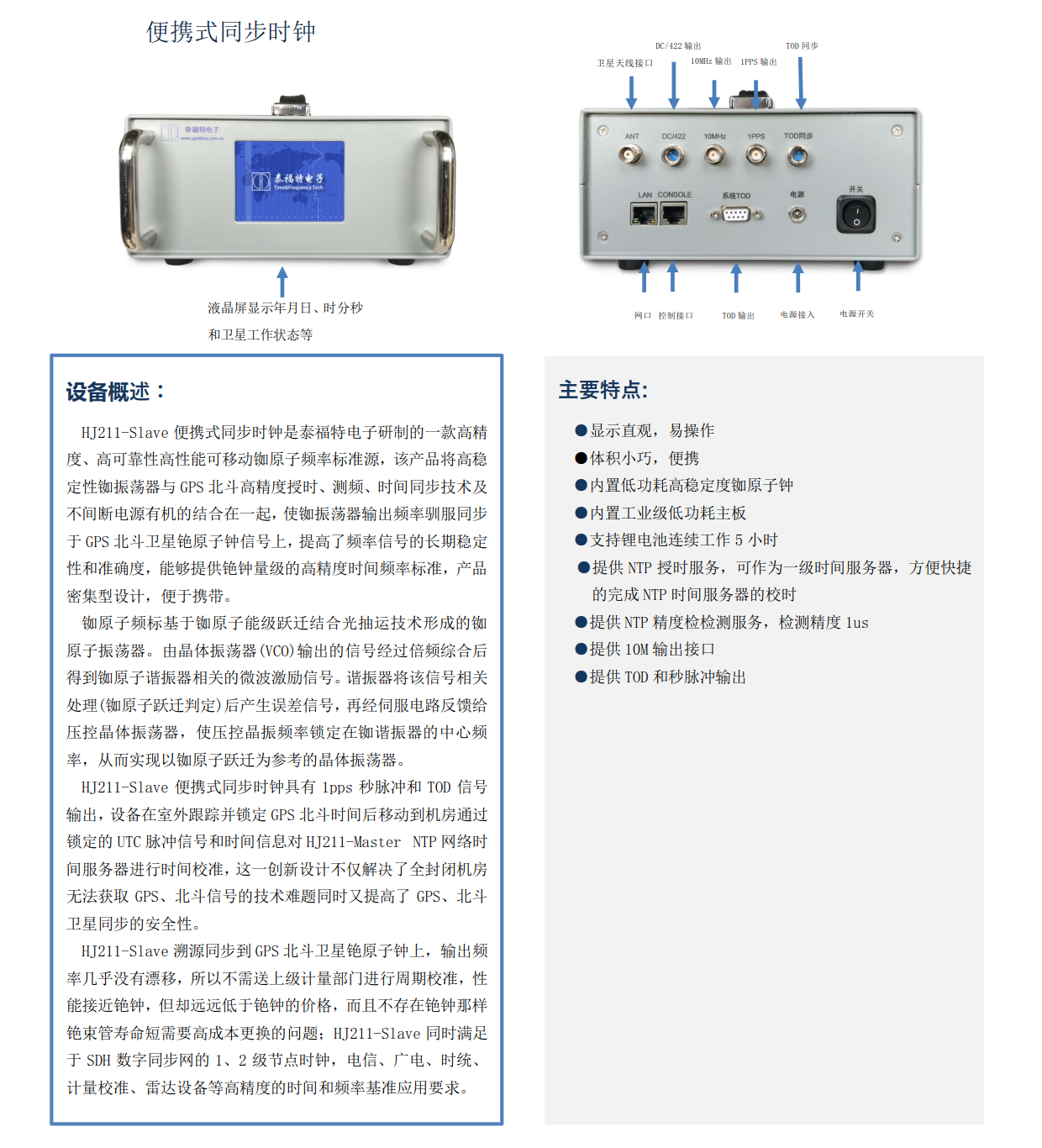HJ211-Slave便攜式同步時鐘是泰福特電子研制的一款高精度、高可靠性高性能可移動銣原子頻率標準源,該產品將高穩定性銣振蕩器與GPS北斗高精度授時、測頻、時間同步技術及不間斷電源有機的結合在一起,使銣振蕩器輸出頻率馴服同步于GPS北斗衛星銫原子鐘信號上,提高了頻率信號的長期穩定性和準確度,能夠提供銫鐘量級的高精度時間頻率標準,產品密集型設計,便于攜帶。...